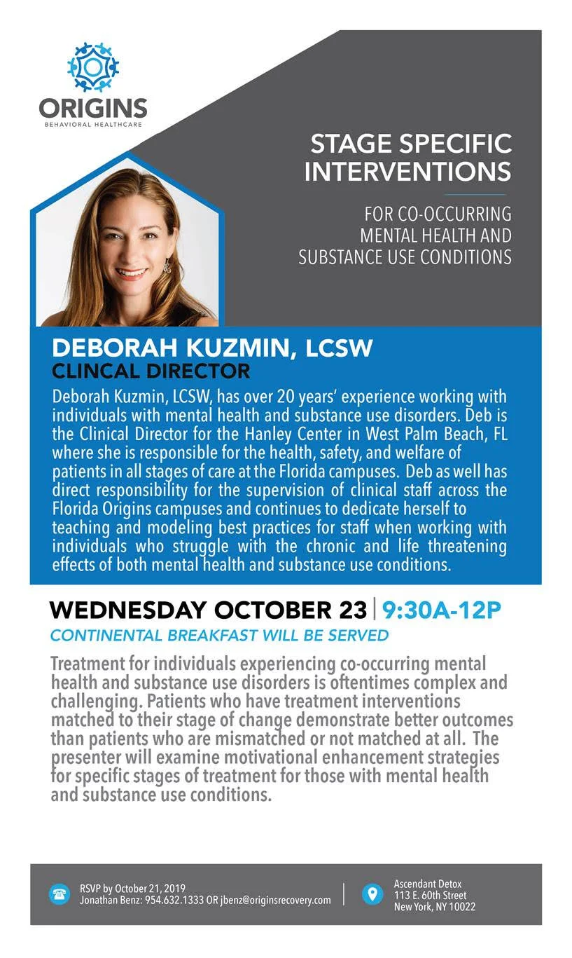 Stage Specific Interventions for Co-Occurring Mental Health and Substance Use Conditions Wednesday, October 23, 2019 9:30 AM 12:00 PM 09:30 12:00 Ascendant Recovery 113 E.60th St. New York USA (map) Google Calendar ICS Please Join us! 2 CE’s for Social Workers available. RSVP to Jonathan Benz at JBenz@originsrecovery.com